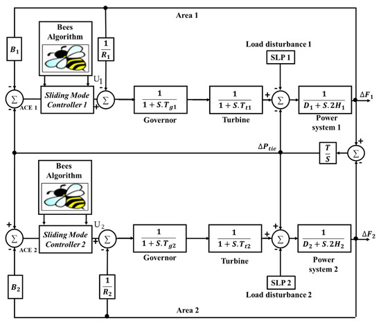 Many scholars have revealed in the literature that the SMC could solve the issue of LFC to a great extent [26,27]. It is also verified that soft computing techniques could remarkably improve the performance of controllers. Therefore, in this paper and in view of the above-said statement, an SMC design is proposed to handle the problem of LFC in an unequal two-area power system, the mathematical model of the suggested SMC is derived based on the parameters of the investigated system. A widely studied two-area interconnected power system [7,14] is considered in this work as a testbed system to examine the potentiality of the SMC as an LFC system. Moreover, as the superiority of the Bees Algorithm over other algorithms has been proved in [15], this algorithm has been selected to optimise the parameters of SMC, this is to achieve an optimal performance of the proposed controller. Integral Time Absolute Error (ITAE) is taken as an objective function to find the optimal gains of the SMC by BA. To prove the supremacy of the proposed SMC based BA, the results obtained from applying the proposed SMC-based BA are compared with those of previously published works for the same system based on Fuzzy PID tuned by TLBO presented in [14] and traditional PID-based LCOA [7]. The robustness of the SMC-BA is also verified against a wide range of parametric uncertainties of the testbed system where ten different scenarios of parametric uncertainties are investigated.