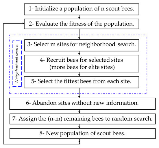 The simplest pseudo-code for this algorithm is shown in Figure 2. The mechanism of this algorithm begins with placing the n scout bees randomly in the search space. In step 2, the evaluation of the fitness of sites visited by the n scout bees is done. The m sites with the highest fitness in specified “chosen sites” in step 3 are selected for neighbourhood or local search. The algorithm in steps 4 and 5 conducts searches in the neighbourhood of the selected sites, with more bees assigned to the best e sites. Selection of the best sites could be conducted directly based on the fitness associated with them. Alternatively, using the fitness values, the probability of sites being selected is determined. Searches in the neighbourhood of the best e sites which represent the most promising solutions are made more prominent by recruiting more bees for them than for the other selected sites. Together with scouting, this differential recruitment is a key operation of the Bees Algorithm. For each patch, only the one bee that has found the site with the highest fitness (the “fittest” bee) is selected in step 5 to form part of the next bee population. In steps 6–8, the remaining bees in the population n are assigned randomly around the search space to scout for potential new solutions or to conduct the global search. These eight steps are repeated until a stopping criterion is met. The colony will have two parts to its new population at the end of each iteration: representatives from each selected patch and other scout bees assigned to conduct random searches [38].
