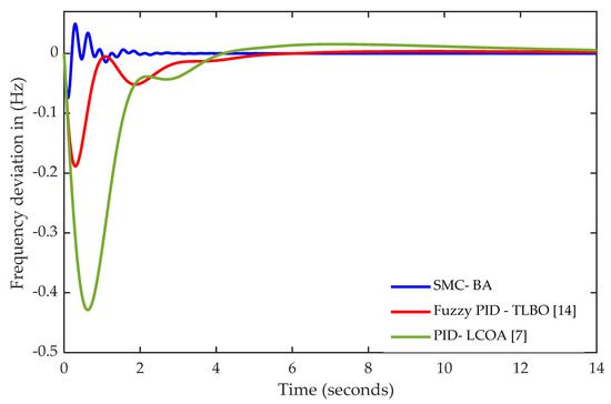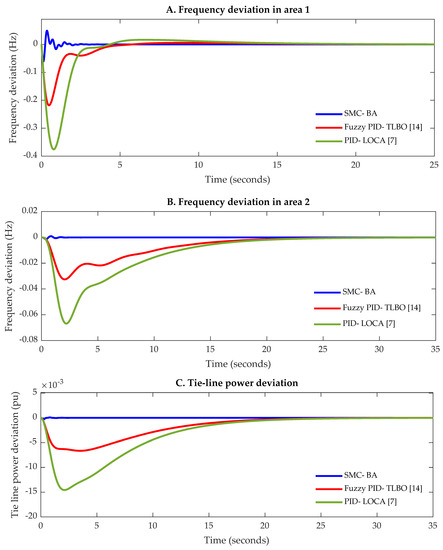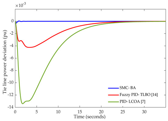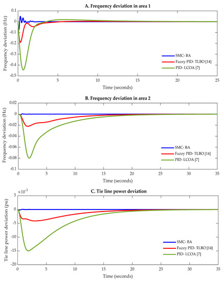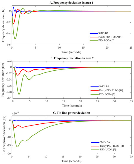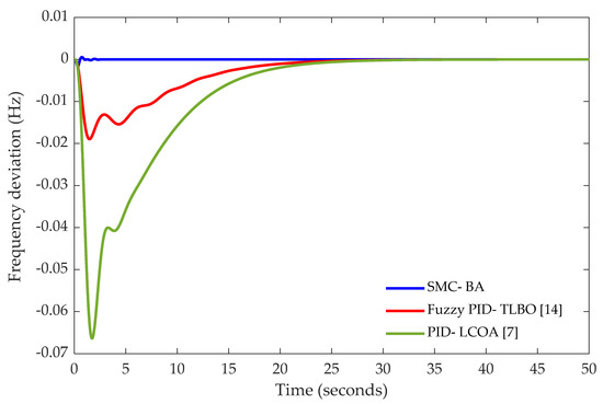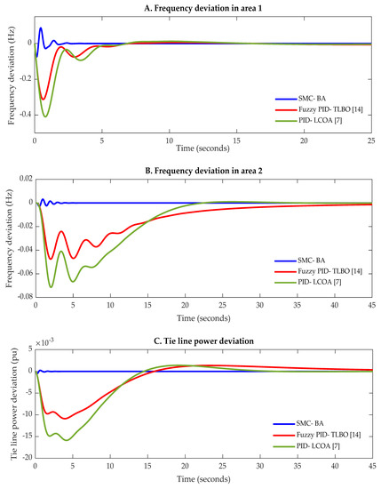 The frequency variation in area one, frequency variation in area two, and tie-line power variation following the sudden 0.2 pu disturbance applied in area one are shown in Figure 3, Figure 4 and Figure 5, respectively. From Figure 3, Figure 4 and Figure 5, it is found that the SMC tuned by BA employed for LFC in the dual-area power system offers a better dynamic response compared with those provided in [7,14]. The undershoot , overshoot and settling time of the frequency in both areas and tie-line power along with the values of the objective function are illustrated in Table 5.
