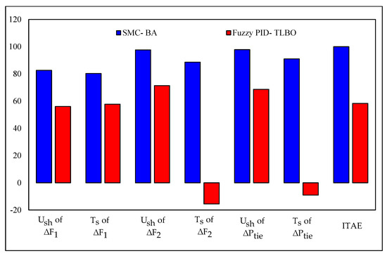Based on the characteristics provided in Table 5, the percentage of improvement in for the SMC proposed in this research and Fuzzy PID controllers [14] in comparison with the LCOA-based PID controller [7] is shown in Figure 6. From Figure 6, it is observed that with BA-optimised SMC, undershoot and settling time in the frequency deviation of area one are improved by 82.60% and 80.3055%, respectively. While in (), the undershoot and settling time in frequency deviation are improved by 97.59% and 88.606%, respectively, and in () they are improved by 97.76% and 91.01%, respectively. Based on the results shown in Figure 3, Figure 4, Figure 5 and Figure 6 and Table 5, it is confirmed that the proposed SMC design offers the fastest response with the minimum undershoot, which in turn guarantees the best stability.