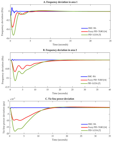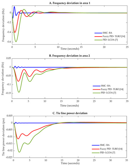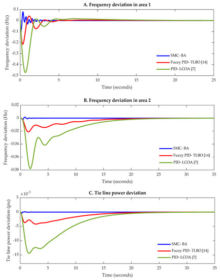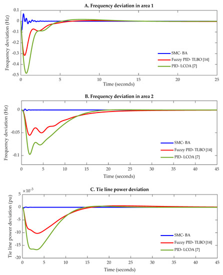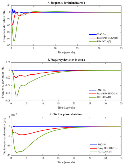 The frequency variation in area one, frequency variation in area two and tie-line power variation following the implementation of the disturbance in area one under different scenarios of system parametric variations are shown in Figure 7, Figure 8, Figure 9, Figure 10, Figure 11, Figure 12, Figure 13, Figure 14, Figure 15 and Figure 16. In Figure 7, Figure 8, Figure 9, Figure 10, Figure 11, Figure 12, Figure 13, Figure 14, Figure 15 and Figure 16, subfigures (A) illustrate the frequency deviation in area one, subfigures (B) illustrate the frequency deviation in area two and subfigures (C) illustrate the tie line power deviation. Moreover, the dynamic response of the system represented by undershoot , overshoot and settling time () in are presented in Table 7. Additionally, Table 7 provides the undershoot , overshoot and settling time () in .