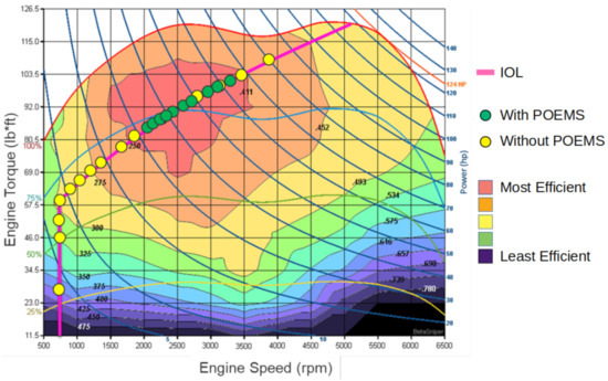 POEMS achieve greater FE by ensuring that the engine is used in regions of maximum efficiency as often as possible. This concept is shown in Figure 2 which includes a Brake-Specific Fuel Consumption (BSFC) map for an example engine and different combinations of engine speed and torque which produce different engine efficiencies. Thus, most engine controllers attempt to operate the engine along its Ideal Operating Line (IOL) [34] which contains the most efficient torque for a given engine speed. POEMS use information about future vehicle velocity to ensure that the engine only operates in the most efficient segment of the IOL, what can be thought of as an Ideal Operating Line Segment (IOLS).