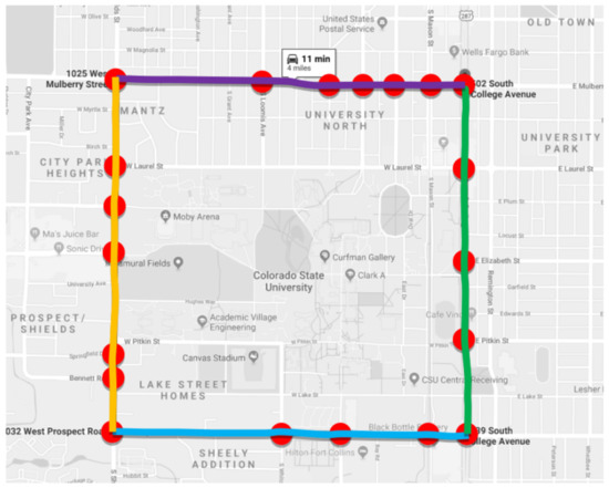 In order to gauge the effects of real-world data-based predictions on the performance of POEMS, a real-world dataset was required. It was desired to gather data in conditions which would allow for optimal POEMS performance such that the relative differences between various POEMS methods would be as great as possible. A secondary consideration was that, in order to allow for optimal ML and ANN prediction performance, the data collection should be conducted along a repeating drive cycle and that this cycle should be short enough that more than 10 cycles could be collected in a single day. The drive cycle which was selected was a 4 mile long drive cycle along urban arterial roads in downtown Fort Collins, Colorado which is shown in Figure 3.