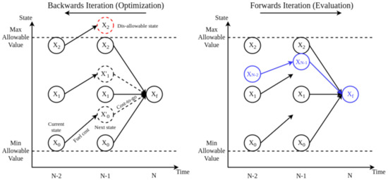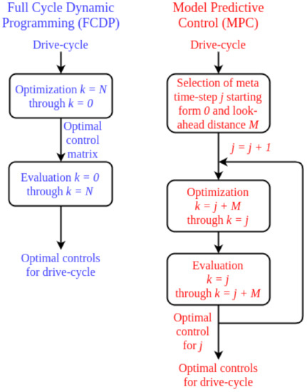 DP is a numerical method based on Bellman’s principle of Optimality, which solves multistage decision-making problems and finds the global optimal solution by operating recursively backwards through time and storing only the optimal controls at each step [46,47]. DP and its derivative strategies have been applied to the problem of FE optimization for HEVs previously [6,10,48,49] for full and partial drive cycles as well as for perfect and real predictions.