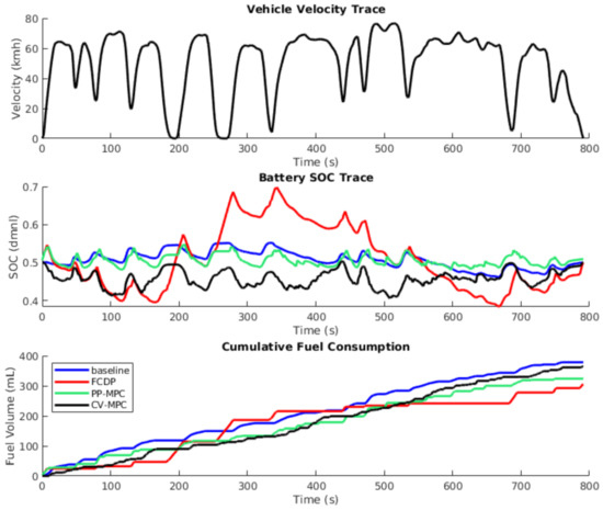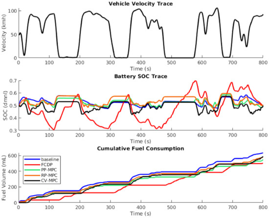 The robustness of DP to velcity prediction error is directly demonstrated in the CV-MPC method which uses a “null” prediction of constant current speed over the entire prediction horizon. It showed significant improvements over baseline while the RP-MPC method showed significant improvements over CV-MPC. An examination of the data trace for all methods using predictions based on group A data for a 10 s prediction horizon are shown in Figure 10.