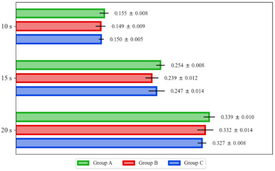 As is evident in Figure 7, the difference in prediction performance between LSTM DNNs trained on the different data groups was minimal if slightly favoring group B over A and C. A visual comparison of the predictions for all groups at 10 and 20 s is shown in Figure 8.