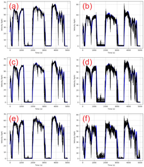 Predicted (black) vs. actual vehicle velocity (blue) for LSTM DNN trained on all data groups at 10 and 20 s prediction horizon. (a) is group A at 10 s, (b) is group A at 20 s, (c) is group B at 10 s, (d) is group B at 20 s, (e) is group C at 10 s, (f) is group C at 20 s.