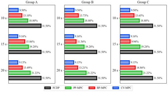 Using the predictions from the cross validation study mentioned in Section 3.1, FE simulations were conducted using the DP-derived methods and Autonomie baseline controls. The mean FE results for this study are listed in Table 11 and percentage improvements over baseline for the DP-derived methods with all data groups and at 10, 15, and 20 s are shown in Figure 9.