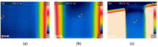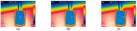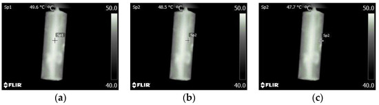In order to confirm the occurrence of this phenomenon, three additional thermograms were made on the cylindrical case of the capacitor, which showed an electrolytic capacitor with a diameter of ϕ = 4 mm. In this case, the capacitor was painted with Velvet Coating 811-21 with a known value of the emissivity factor ε ranging from 0.970 to 0.975 for temperatures between −36 °C and 82 °C. The uncertainty with which the value of emissivity factor was determined was 0.004 [29]. A layer of the paint was applied to the outer surface of the capacitor. During the making of the thermograms, the capacitor was placed on a heating mat at a temperature of 60 °C. The temperature of the mat was selected arbitrarily so that it differed from the value of ϑa. The measurement was taken only after the temperature of the capacitor stabilized. The recorded thermograms are shown in Figure 2.