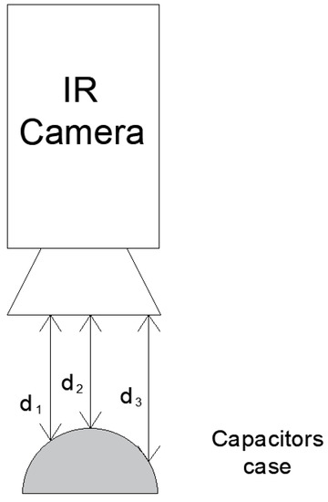The phenomenon recorded in Figure 1 and Figure 2 is the result of the occurrence of two phenomena: the change in d and the angular emissivity. The capacitor case has the shape of a cylinder. For this reason, the distances between the lens of the thermographic camera and specific parts of the capacitor case will be different. The damping of the atmosphere layer τa between the observed capacitor and the lens of the thermographic camera changes together with the change in d. The relationship between both quantities is described by Equation (2) [29,30]: