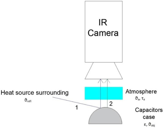 Reflected temperature ϑrefl is also called reflected radiation [32] in the literature. It is the radiation emitted by an object that is in the vicinity of the object under observation. The reflected radiation reaches the lens of the thermographic camera together with the radiation emitted by the object under observation. There is no mathematical model that would accurately describe the value of ϑrefl in every case. For this reason, to minimize the influence of ϑrefl on the value of ϑobj, the value of ϑrefl should always be measured. The measured value of ϑrefl should be entered in the software of the thermographic camera before checking the degree of heating of individual capacitor cells. The relationship between ϑobj and ϑrefl can be described by Equation (3).