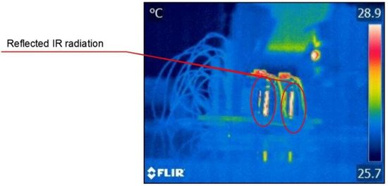 An example of the recorded reflected radiation is shown in Figure 5, where capacitors used for compensating reactive power can be seen. Reflected radiation was registered on both capacitor cases, which were made of aluminum.