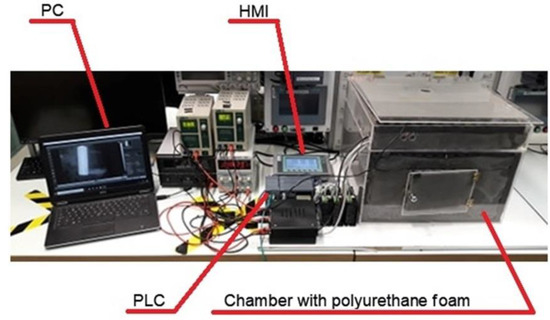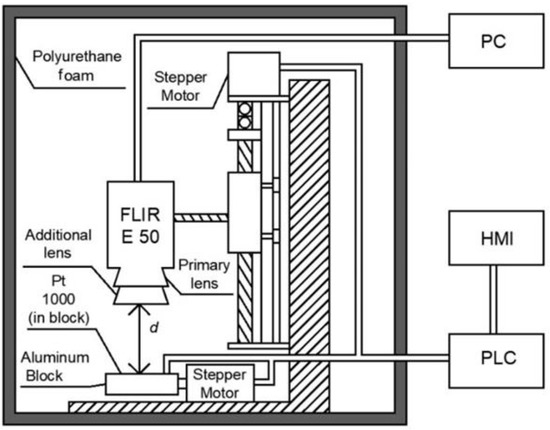 The first part of the experiments described in this article was carried out using a specially constructed stand. The stand consisted of three parts: a chamber with the measuring instruments, a control part, and a laptop with Flir Tools + software. The most important device in the stand was the Flir E50 thermographic camera (Flir, Wilsonville, OR, USA) [33]. In order to obtain appropriate spatial resolution, the camera was equipped with an additional Close-up 2× lens (Flir, Wilsonville, OR, USA). This made it possible to obtain an IFOV (Instantaneous Field of View) of 67 µm [34]. The camera with an additional lens was mounted on a linear module. In turn, the linear module was attached to a metal angle. The linear module was controlled by a stepper motor [35]. Consequently, it was possible to change d with a precision of 0.1 mm. The distance d was controlled by means of an appropriately mounted potentiometric offset sensor MMR30, with a nominal resistance value of 10 kΩ [36]. This sensor made it possible to measure the distance d in the range of 0–30 mm, with a precision of 0.1 mm. At a distance of about 30 mm from the lens, an aluminum block sized 16 mm × 16 mm × 45 mm was placed. The surface of the block, monitored with a thermographic camera, was painted with Velvet Coating 811-21. The block temperature was monitored with a Pt 1000 sensor [37]. The monitored block was connected to a stepper motor. Consequently, it was possible to change α with a precision of 0.9°. In order to run the indivudual parts of the experiment, the block was replaced with a heating plate of a known temperature. The entire set was placed in a chamber made of plexiglass with the external dimensions of 45 cm × 45 cm × 33 cm. In order to minimize the influence of reflections and ensure proper optical isolation, the interior of the chamber was lined with black polyurethane foam. Due to the porous structure of the foam and its color the value of factor ε equaled 0.95 [38] inside the chamber. Additionally, the metal components inside the chamber were painted black. Using the Siemens S7-1200 1214C DC/DC/DC PLC controller (Siemens AG, Munich, Germany) [39], all actuators and readings were made from the sensors. This controller supported the HMI touch panel (Siemens AG, Munich, Germany) [40], by means of which it was possible to set the required settings and read them.