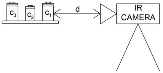 The second part of the experiment was carried out on a stand consisting of a Flir E50 thermographic camera (without an additional lens) and the tested capacitors for reactive power compensation. The capacitors were star-connected to increase their temperature to the operating temperature, higher than the ambient temperature. The distance between the capacitors and the lens was measured with a precision of 1 cm. In the last part of the work, the capacitors were changed to a cylinder made of aluminum with an adjustable diameter. A piece of metal (aluminum), which was industrial waste, measuring 90 cm × 4 cm was used. Using that method, attempts were made to recreate the conditions prevailing during the thermographic temperature measurement of the operated capacitor bank. A diagram of the measuring system is shown in Figure 8.