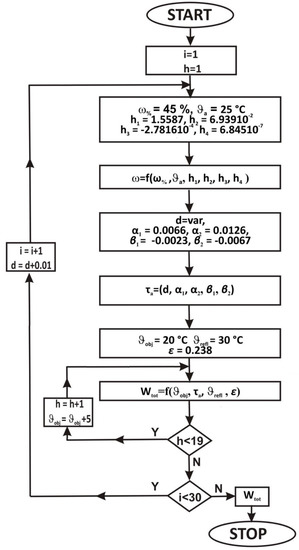 In the first part of the simulation, the Wtot value was determined for the ϑobj value in the range from −20 °C to 70 °C, changed in steps h = 5 °C. The lower value of the assumed range, ϑobj, is the assumed ambient temperature. The upper limit of the range is the highest possible temperature of the capacitor case that can be found in the catalogs. During the simulation, the Wtot values were determined according to the algorithm shown in Figure 10 for all variable values. The values of the coefficients used were taken from [29].