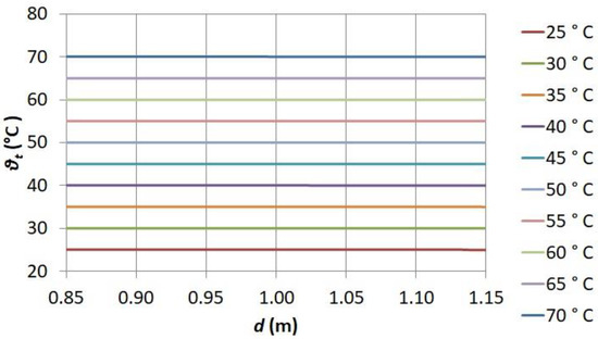 As a result of the simulation work carried out, it was checked how the result of the ϑt value would change due to the change in d caused by placing the measurement point on various parts of the case. Based on the analysis of the available technical documentation, it was assumed that the diameter of the capacitor case intended for reactive power compensation would not exceed 3000 mm. This means that the difference between the largest and smallest d values will not be bigger than 1500 mm [41]. The simulation was performed for standard conditions (ϑa = 25 °C). The half of the range of values recorded in the laboratory (45%) was adopted as the value of ω%. The given criteria were followed by selecting the ϑrefl value of 30 °C. The ε was chosen for aluminum (ε = 0.238). It was assumed that the range d would be changed from 0.85 m to 0.15 m. It was an arbitrarily adopted distance of 1 m changed by the range resulting from the largest assumed capacitor diameter. During the simulation, the value of d was changed with the step of i = 0.01.