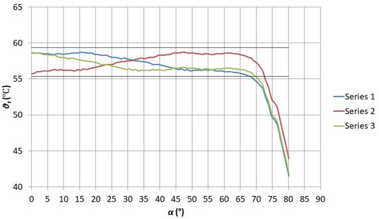 In order to check the influence of α on the value of ϑt, it was decided to repeat the experiment carried out by one of the authors of this article and described in [42]. This was performed to obtain the data that would allow us to estimate the influence of the α value on the ϑcam value in the case of thermographic temperature measurements on the cases capacitors intended for reactive power compensation. An aluminum block with a known temperature of 57.35 °C was observed. In order to minimize the impact of the changing conditions during the measurement, measurements were made by automatic changing of α and simultaneous film recording with a thermographic camera. The results were obtained by analyzing individual frames of the recorded film. The results were made for three series of measurements. The achieved results are shown in Figure 12. In the figure, the black lines indicate the value of the known temperature of the block under observation increased or decreased by the measurement error of the thermographic camera [34].