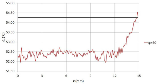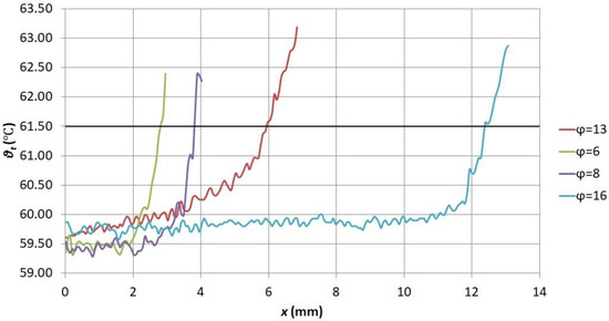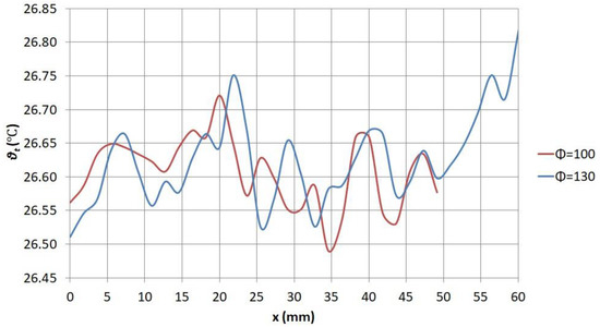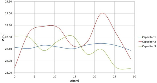 The ϑt values recorded in the thermogram were exported to Excel. The recorded values of ϑt as a function of the position on the case x are shown in Figure 14 and Figure 15. The initial value (x = 0 mm) was the point of the capacitor case that was closest to the thermographic camera lens (in the middle of the capacitor case).