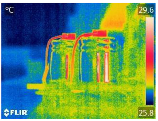 where IFOV is the value of the angle between the adjacent walls of the pyramid, read from the technical documentation of the thermographic camera, the apex of which is in the IR detector of the camera and the base of the object under observation. For Flir E50, IFOV equals 1.82 mrad. Knowing the value of I, the temperature distribution (function ϑt = f(x)) was checked on the metal case of the KJF-0.83/400 capacitors. An example thermogram is presented in Figure 17.