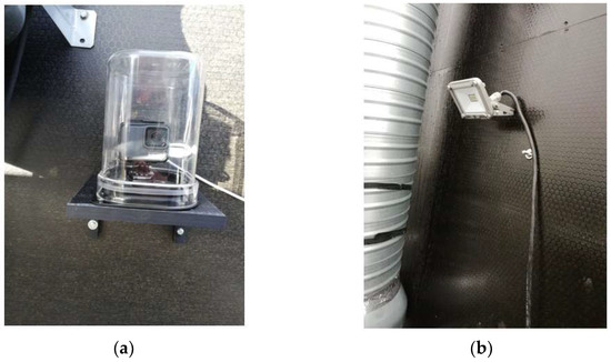 The GoPro HERO7 Silver high-resolution action camera used for monitoring the frost formation on the heat exchanger surface is presented in Figure 1a. It was mounted under a transparent plastic hood perpendicularly to the heat exchanger. In order to visually monitor the formation of frost on the evaporator surface during the hours of darkness, a light source was installed (see Figure 1b).