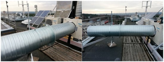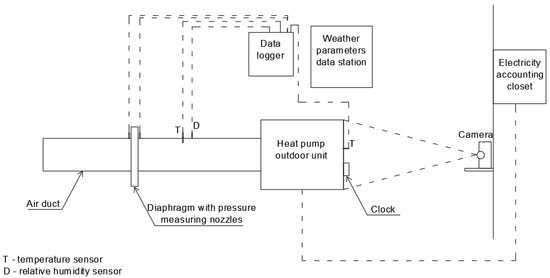 The assembled experimental setup is shown in Figure 2, and its schematic representation is presented in Figure 3. As can be seen from Figure 2, a DN500 duct was mounted on the external unit of the heat pump to determine the amount of air drawn through the evaporator, and an IRIS500 diaphragm was mounted to measure it.
