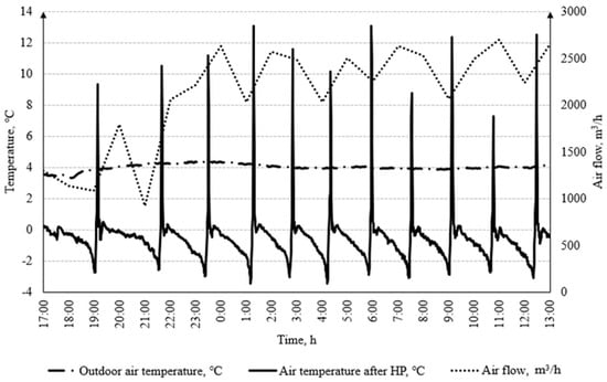 It can be seen that the outdoor air temperature remained almost constant during the selected period. However, the air flow temperature behind the evaporator heat exchanger fluctuated significantly and was lower than the ambient air temperature. Only the peak temperature rises that occur during the defrosting process were observed.