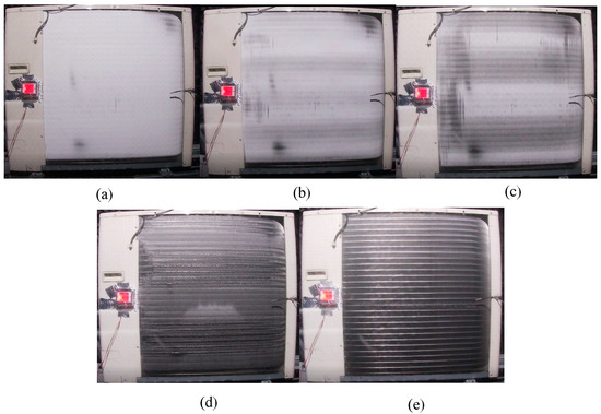 Defrosting the heat exchanger: (a) the first minute—the entire surface covered with frost; (b) the second minute—the start of the melting; (c) the third minute—frost melting; (d) the fourth minute—frost melting; (e) the fifth minute—condensate blowing.
