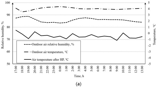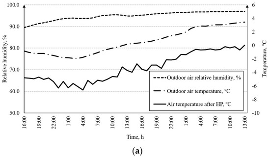 Figure 6a shows ambient air temperature, relative humidity and temperature after ASHP evaporator during the first time period (the processed hourly average data); (b) shows the average hourly change in the COP of the ASHP as a function of the ratio of enthalpies of ambient air and water supplied to the indoor unit. During this period, the lowest relative humidity was 83.4%, and the highest value was 88.5%; the air temperature varied from 3.5 °C to 4.36 °C.