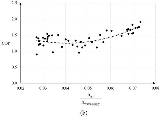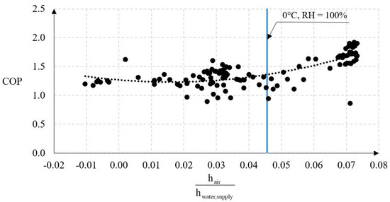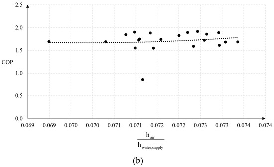 As shown in Figure 8b, we can see that the ratio of enthalpies depends directly on the ambient air parameters: the temperature and the relative air humidity, and this reflects in the air enthalpy since the enthalpy of the water supplied was constant. A direct dependence between the COP and the enthalpy ratio is obtained. As the enthalpy ratio decreases, so does the COP; by analogy, as the enthalpy ratio increases, the COP of the heat pump also grows.