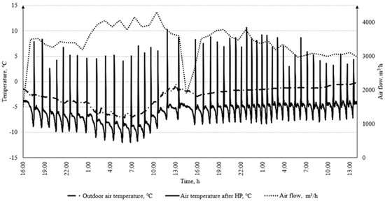 The second time period. During the period of December 1–3, the average ambient air temperature was −2.80 °C (varied from −7.03 °C to −0.37 °C), the average relative humidity was 92.54% (varied from 90.0% to 94.8%) (see Figure 7 and Figure 8). The average air flow through the evaporator‘s heat exchanger was 3404.51 m3/h. Similar to the first period, changes in the air temperature after the evaporator heat exchanger were observed. The obtained measurement results and their comparison with the ambient air temperature and the change of air flow during the experiment are presented in Figure 7 (raw data).
