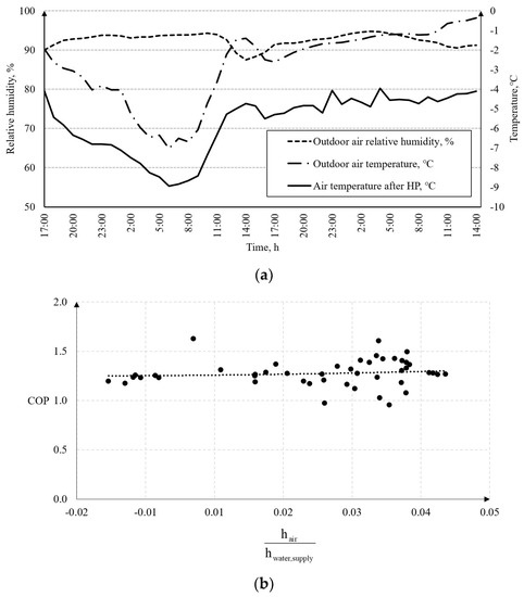 Figure 8a shows ambient air temperature, relative humidity and temperature after ASHP evaporator during the second time period (the processed hourly average data); (b) shows the average hourly change in the COP of the ASHP as a function of the ratio of enthalpies of ambient air and water supplied to the indoor unit.