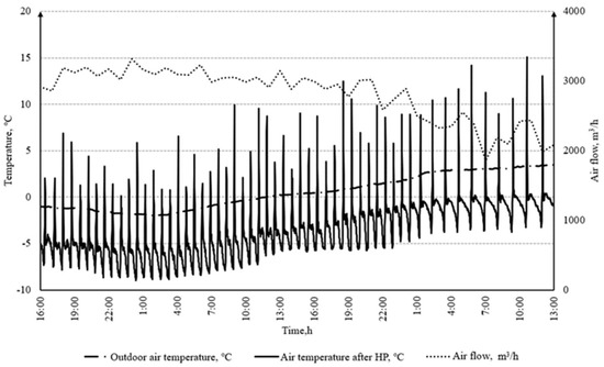 From Figure 9, we can see that the air temperature rose from −1.96 °C to 3.7 °C; however, the air flow temperature after the evaporator’s heat exchanger fluctuated significantly and was lower than the ambient air temperature. As during the first and second experiments, only the peak temperature rises that occurred during the defrosting process were distinguished. During this test, the lowest value of the air temperature after the ASHP was −8.95 °C, the highest value reached 15.1 °C. Such temperature fluctuations were caused by the formation of frost on the evaporator’s heat exchanger and its defrosting cycles. The largest temperature difference between the ambient air temperature and the air temperature with the heat exchanger was 11.80 °C. The Figure shows that the frosting-defrosting cycle of the heat exchanger occurred 54 times during this time period; this means that, on average, complete freezing occurred 1.17 times per hour. The flow of extract air through the evaporator increased with growing frost thickness and was also reduced during the defrosting. This indicates that at higher air temperatures, a lower air flow is required to ensure the same heat carrier parameters.
