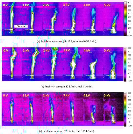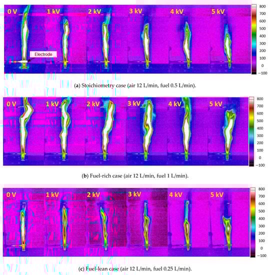 Figure 5 is an image taken with an infrared thermal imaging camera of the shape of the flame that changes when a positive voltage is applied to the electrode. When no electric field is applied, it can be seen that the flame length is shorter in the fuel-lean case (c) than in cases (a) and (b). The length of the coaxial diffusion flame is proportional to the fuel flow rate and inversely proportional to the diffusion coefficient and air-fuel ratio, as was discussed in Equation (1) in the Introduction Section.