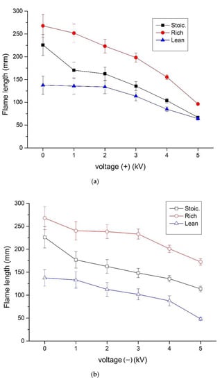 As shown, (a) is the result when the electrode is positively charged, and (b) is the result when the electrode is negatively charged. In the fuel-rich case, where the flow rate (Q) of the supplied fuel was double, and the air-fuel ratio (s) was small, the flame length was the longest in all cases under all voltages (Equation (1)). Additionally, the flame length of the fuel-lean case with a large air-fuel ratio was the shortest in all cases under all voltages.