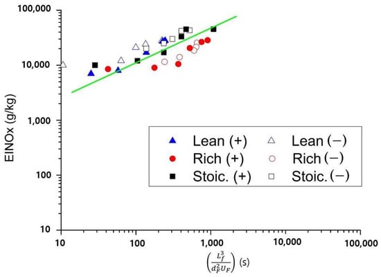 Compared to Equation (7), Equation (9) shows that EINOx is smaller by 0.35 power, which indicates that a smaller amount of NOx is generated in the flame with the electric field.
