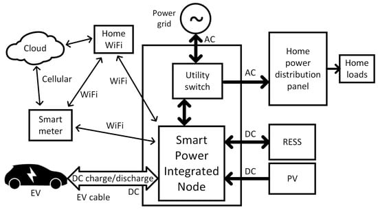 Example of a residential power and energy management system, based on the concept described in a US patent [36]. Such a multifunctional system can ensure V2H operation, providing support during grid power outages and increased resilience.