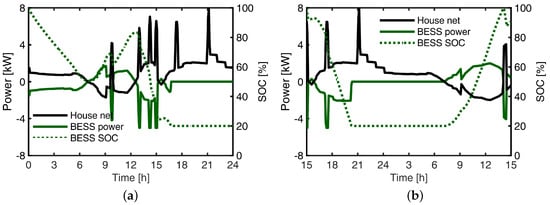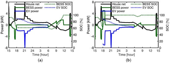 An example of a self-sustained case for the reference house with EV contributing to (a) supply the residential load only, (b) supply the residential load and charge the BESS. Assuming that the EV arrived home every day at 6 p.m. with a SOC of 90% and left home at 6 a.m. the next day.