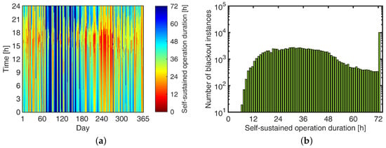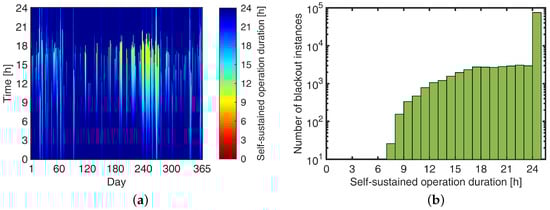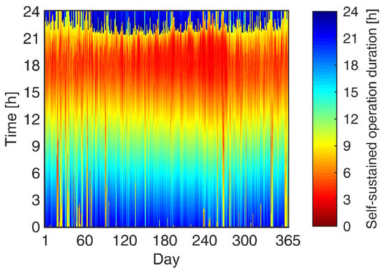 With the simulation time step of 5-min, there are = 105,120 instances throughout the entire year when the power outage could occur. Correspondingly, there are 105,120 calculated self-sustained operation durations which are represented as different colors in Figure 5, with each cell indicating a 5-minute increment. The two instances in Figure 4 result in the colors for the 17 and 5 h for their two cells. Self-sustained operation duration trended towards being longer if the power outage occurred in the early morning because the BESS was charged in the midday by surplus solar PV generation. The self-sustained operation duration around 6 p.m. was short because of both the evening residential load peak and lower solar PV generation.