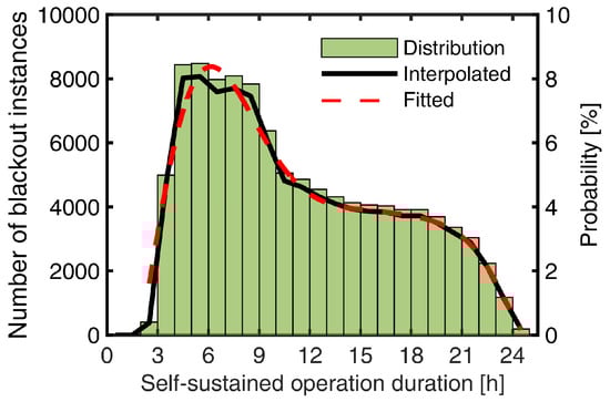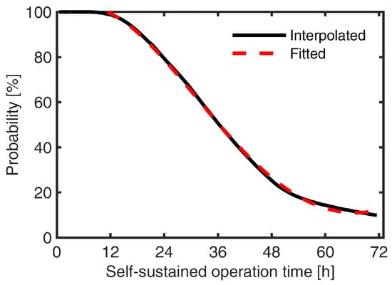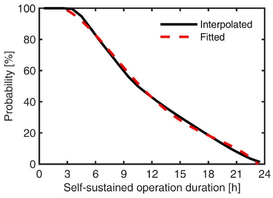 The simulation results of self-sustained operation duration for the entire year were summarized with an interval of 1-h in Figure 6. If the self-sustained operation duration of the house falls into the interval of (, ], it can self-sustain any hours within [0, ]. The cumulative probability curve presented in Figure 7 indicates that after a power outage occurrence, the reference house is almost 100% likely to self-sustain for up to 3 h, and 50% likely to self-sustain up to approximately 10 h. The cumulative curve, which stands for the building resilience, was fitted and represented explicitly with a 4th order polynomial equation, as follows: