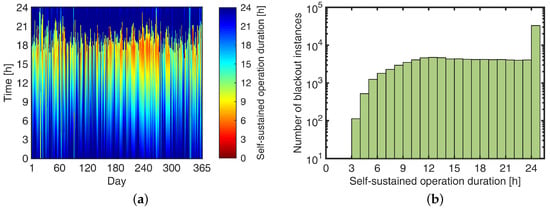 Self-sustained operation duration of the house with 50% of the reference residential load presented as a (a) heat map and (b) distribution. The likelihood of the house self-sustaining for more than 24 h is approximately 31%.