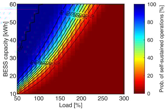 The effect of combining partial load and BESS capacity modifications on self-sustained operation duration were studied and for each combination, only the probability of self-sustaining for at least 24 h was recorded. For example, the combination of 50% load percentage and 11 kWh BESS resulted in a 31% likelihood of self-sustaining for at least 24 h, as shown in Figure 9. The simulation results for other combinations were summarized in Figure 12. The load percentages from 50% to 300% covered are representative of the power profiles of residences with different user behaviors and house types. BESS capacities studied were between the range of 10 to 60 kWh. The colors represent the probabilities for residences with combinations of different load percentages and BESS capacities to self-sustain for more than 24 h.