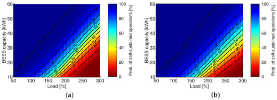 In Figure 12, the vertical trend indicates that for a fixed load percentage, the probability of the residence self-sustaining for more than 24 h increased, in line with the expectations, as the BESS capacity increased. The case study for increasing the BESS capacity to 27 kWh from Figure 11 can be referred to as the Load = 100% case vertically. When the BESS capacity was increased from 11 kWh to 27 kWh, the probability for the house to self-sustain for more than 24 h increases from virtually 0% to 72%. For a house load percentage of less than 250%, increasing the BESS capacity significantly increases the residence self-sustainment duration.