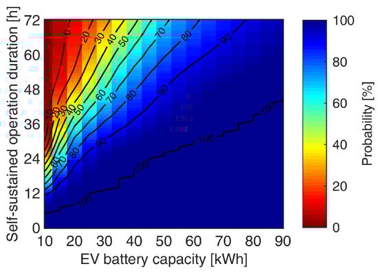The effect of different EV battery ratings were studied and results are shown in Figure 18. All parameters apart from the EV energy capacity are kept the same as the reference house (Table 1). The probability shown in Figure 17 is represented by the case of fixing the x-axis at 20 kWh. At this value, the colors show that there exists approximately 80%, 26%, and 10% probability for self-sustainment duration of 24, 48, and 72 h, respectively. EV battery capacities of 30 kWh, 60 kWh, and 90 kWh give the residence a 100% probability to self-sustain approximately 12, 30, and 45 h, respectively. The probabilities for residence with EV battery capacities of 30 kWh, 60 kWh, and 90 kWh to meet a given duration target, e.g., 48 h, are approximately 60%, 92%, and 98%, respectively.