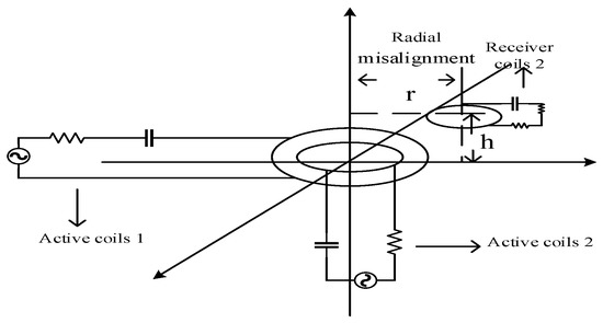 Considering double transmitting and single receiving coils, the two transmitting coils are coaxial with different radii. With the increase in radial misalignment, the mutual inductance between the two transmitting coils and the receiving coil changes according to Equation (3). However, for the receiving coil, the total mutual inductance is the sum of mutual inductance between the two transmitting coils and the receiving coil, which compensates for the reduction in mutual inductance; Maxwell simulation verifies this conclusion.