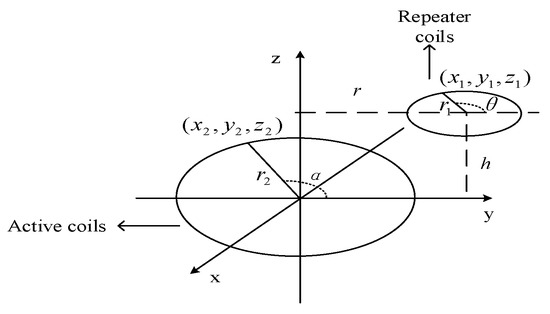Only the mutual inductance mode of the single transmitting and single receiving coils is considered, as shown in Figure 2. The center of the transmitting coil is placed in the coordinate system (0, 0, 0), and the center of the receiving coil is placed in the coordinate system (0, t, h).