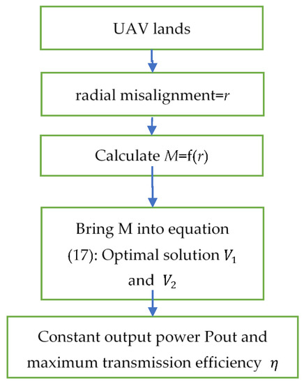 Thus, researchers began to research the application of magnetically coupled resonant technology to charge UAVs for solving this limitation [2,3,4,5]. This method creates a base station where the batteries can be automatically charged after landing [3]. The proposed magnetically coupled resonant system in [2] is mainly composed of two coils, namely, a single transmitting coil and a single receiving coil. The power transmission efficiency between the two coils is a function of the vertical distance between the two coils and the power supply. When the two coils are coaxial, the power transmission efficiency of the coil is the highest, and when the distance between the two coils is increased, the power transmission efficiency decreases. In the practical charging process of UAVs, the coaxial position of the receiving coil and the transmitting coil cannot be guaranteed, namely, radial misalignment, which will lead to a reduction in output power and charging time delay [6]. Therefore, it is necessary to research the power compensation problem of misaligned charging.