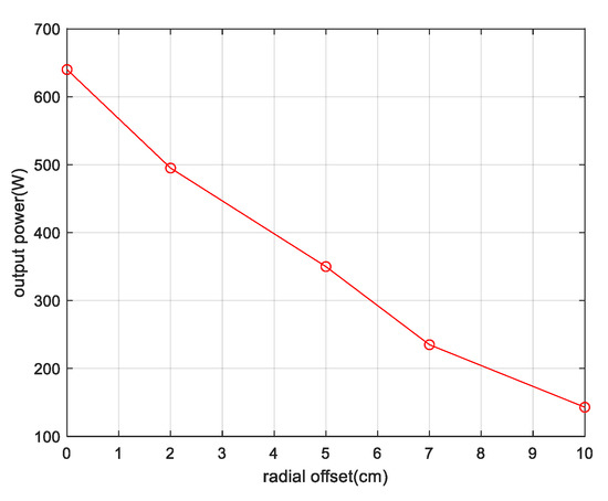 In addition, different radial misalignment will cause a decrease in the mutual inductance between the receiving coil and the transmitting coil, resulting in a decrease in power. As shown in Figure 7, when the peak input voltages of the two active coils are both 570 V, the output power is negatively correlated with the radial misalignment.