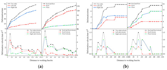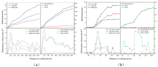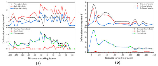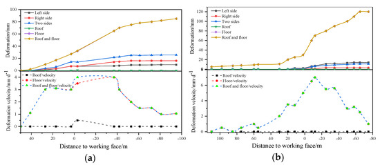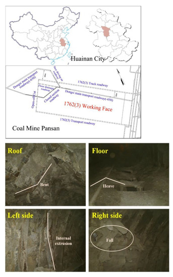 - Sun, Z.H.; Xie, W.B.; Zhang, J.W.; Cheng, X.J. Surrounding rock deformation regularity and control technology of soft rock roadway in floor during across mining. Coal Technol. 2016, 35, 65–67. [Google Scholar]