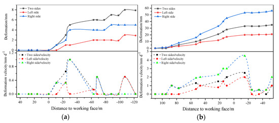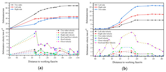 - Guo, Y.; Zheng, X.G.; Guo, G.Y.; Zhao, Q.F.; Zhou, W.; An, T.L. Study on deformation failure and control of surrounding rock in soft rock roadway in close range coal seam with overhead mining. J. Min. Saf. Eng. 2018, 35, 56–63. [Google Scholar]