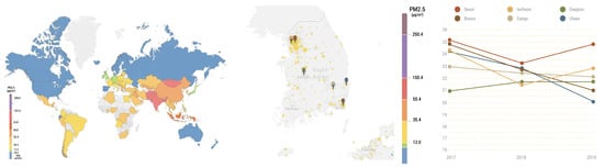According to the 2019 World Air Quality Report, which surveyed the average concentration of fine particulate matter (PM2.5) in 98 countries around the world, revealed that Korea’s air pollution level is the 26th most serious in the world and that the average concentration of ultrafine dust in Korea is the highest among OECD countries. In particular, Seoul was found to be the worst in Korea at 24.8 g/m. In Figure 1, panels A and B present average PM2.5 exposure by country during 2019 and PM2.5 annual mean (g/m) in Seoul, respectively.